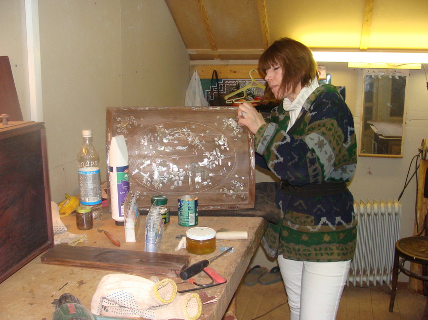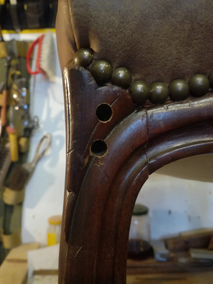Глубокие трещины и сколы первоначально заполняются кусочками древесины посредством подклейки. После чего происходит шлифовка соответствующих мест и восстановление их цвета в соответствии с цветом всей мебели.